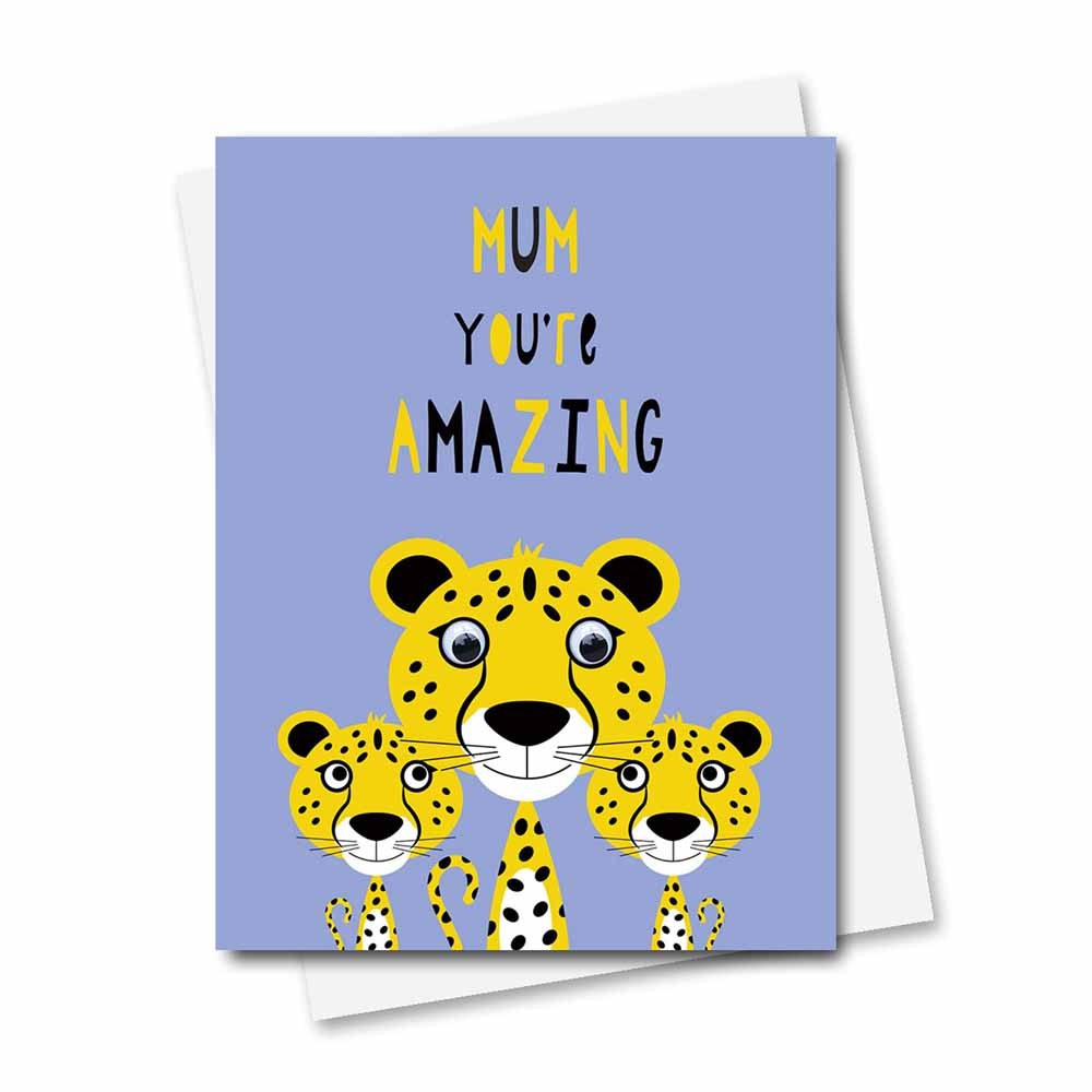 Wonderful cards with moving wobbly eyes. Really cute and fun card to brighten up someone's day. Supplied with envelope, within cellophane bag. Left blank inside for your own message.