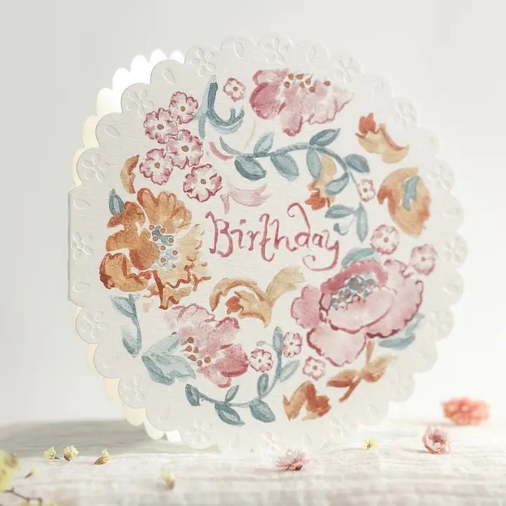 Designed to ignite feelings of sentiment & nostalgia. Lovingly hand-painted, small batch printed, die-cut & embossed in Nottingham. Printed on fine 300gsm card. Circular die-cut scalloped edge card.