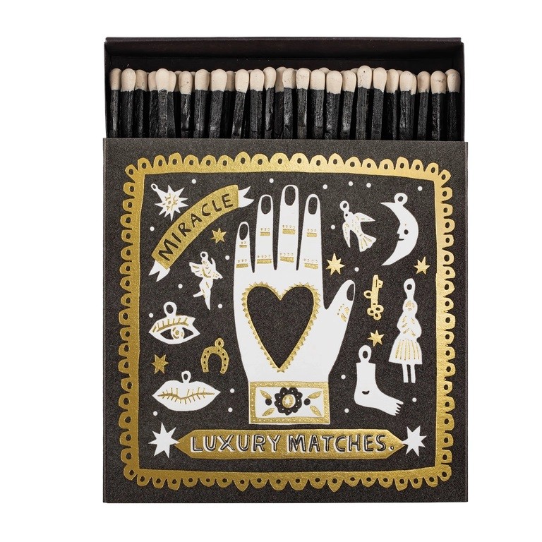 Square matchbox featuring the illustration of a hand with a heart in the middle surrounded by an array of different charms and gold foil detailing with the words 'Miracle Luxury Matches.'