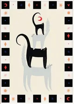 Four cat friends sit atop one another looking up to a crescent moon, bordered by a striking black and white grid pattern framing this playful design. The perfect addition to any cat lover’s collection.