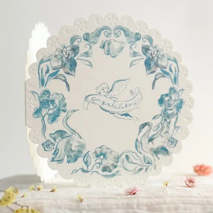 Designed to ignite feelings of sentiment & nostalgia. Lovingly hand-painted, small batch printed, die-cut & embossed in Nottingham. Printed on fine 300gsm card. Circular die-cut scalloped edge card.