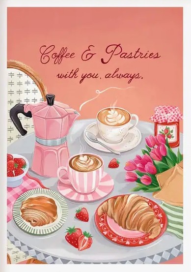 Featuring a pink moka pot, latte art, buttery croissants, sweet strawberries, and tulips resting beside a jar of jam, this illustration celebrates those timeless moments of coffee and conversation.