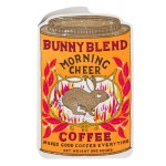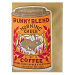Letterpress cut-out card featuring an orange tin with a bunny on the front and the words 'Bunny Blend, Morning Cheer, Coffee.' Designed by Charlotte Farmer.