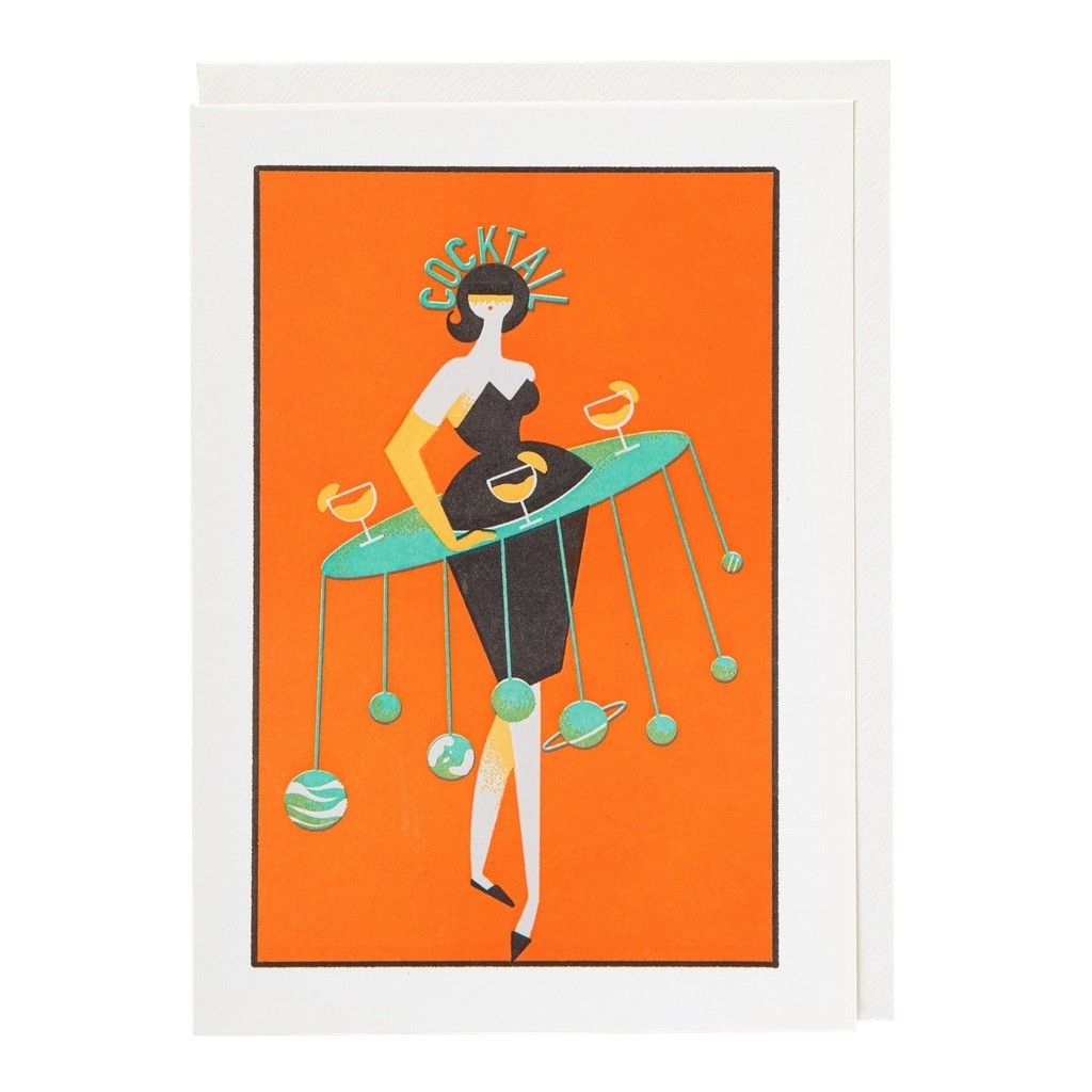 Letterpress card with an orange background featuring the illustration of a lady wearing a planet-inspired drinks tray around her waist, with the word 'cocktail' as a hat on her head.