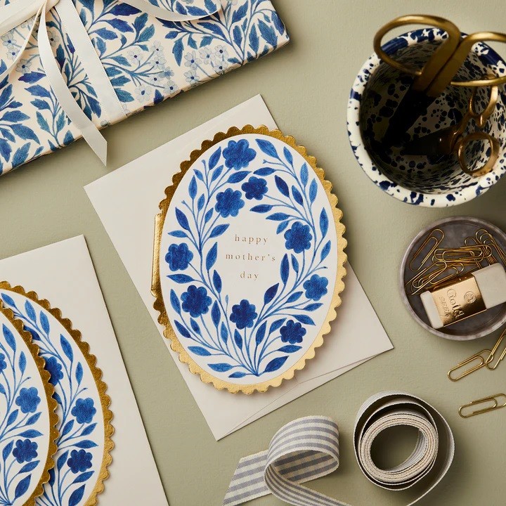 A beautiful oval card just in time for Mother's Day. This design features gold scallops and blue delft print, and despite it's oval shape can stand on a mantelpiece like a normal card.