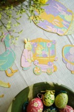 Hand printed three metre long paper garland, featuring screen printed paper easter characters, each around 10cm in height. The garland is printed on both sides on thick, hand made cotton paper. The shapes are sewn in a random order along strong cotton thread, with hanging loops either end, meaning the garland can be hung straight away!
