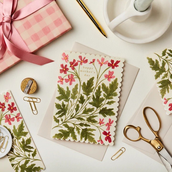 This card features a die cut scalloped edge and beautiful all over floral print in green and pink. This particular drawing is inspired by the shape and flowers of favourite Pelargoniums; Sidoides and Lavender Lass.