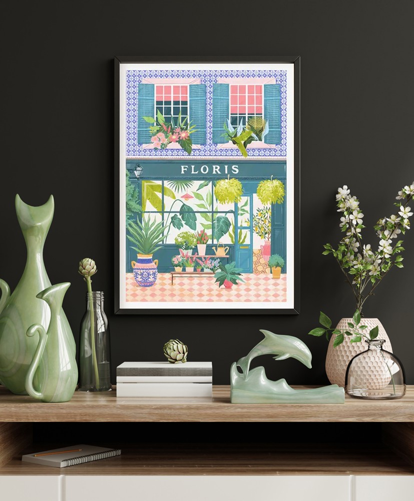 This botanical art print features a florist shop full of a range of different plants and florals. This illustration is based upon the many florist's shops up and down the land. Mixing lots of different elements from different florist shop's to create a truly unique and colourful print. This Florist shop poster would make the perfect gift for someone who loves plants and flowers.