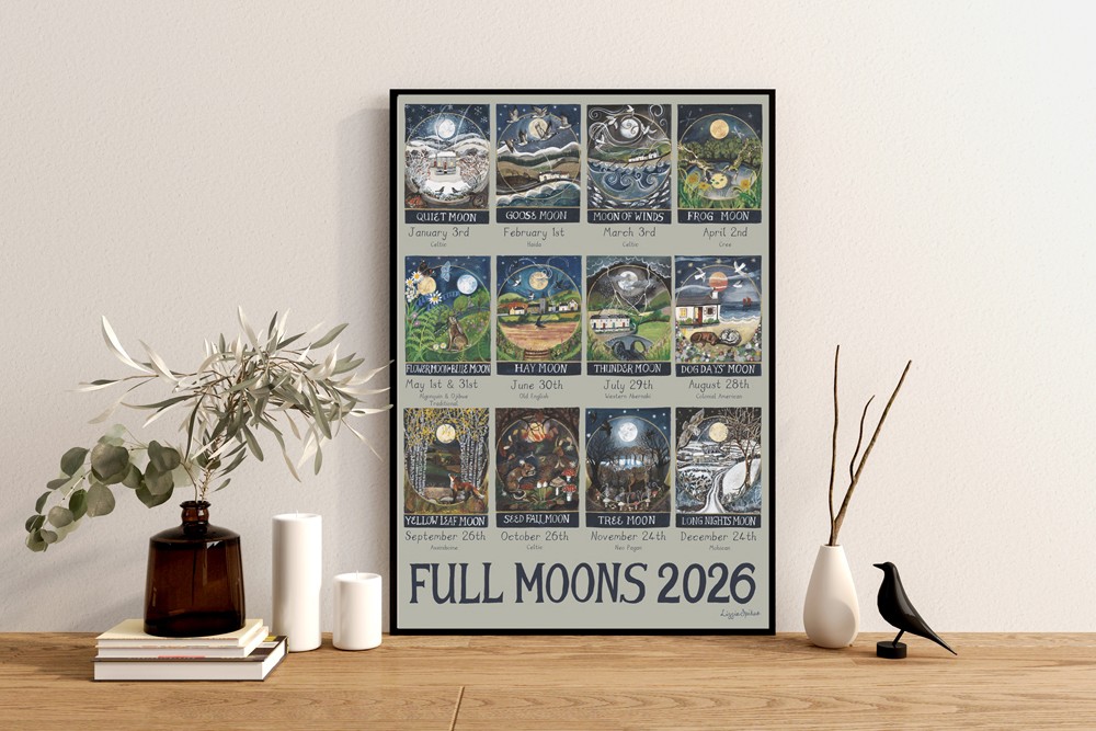 This illustrated print shows some of the many names that our Full Moons have been given by different cultures over the centuries along with the dates of the forthcoming full moons in 2026. Inspired by many of a Celtic, N. American and Old English derivation. The paintings, like the Moon names, capture the changing of the seasons and the passing of the year.