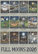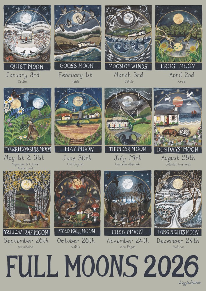 This illustrated print shows some of the many names that our Full Moons have been given by different cultures over the centuries along with the dates of the forthcoming full moons in 2026. Inspired by many of a Celtic, N. American and Old English derivation. The paintings, like the Moon names, capture the changing of the seasons and the passing of the year.