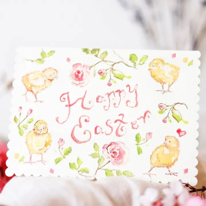 Lovingly hand-painted watercolour illustration, printed in small batches on fine 300gsm paper, with die-cut scalloped edge. Accompanying 135gsm envelope.