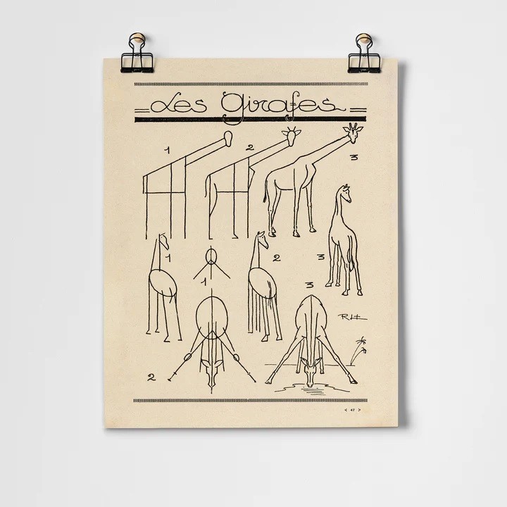 Uncovered set of vintage step by step ‘How to Draw Giraffes' illustration from a pile of educational books from the 1930s at a flea market in Paris, France. Carefully digitally restored illustrations to create a unique art print. Giclée printed on 200gsm museum quality paper with a textured, matt finish.