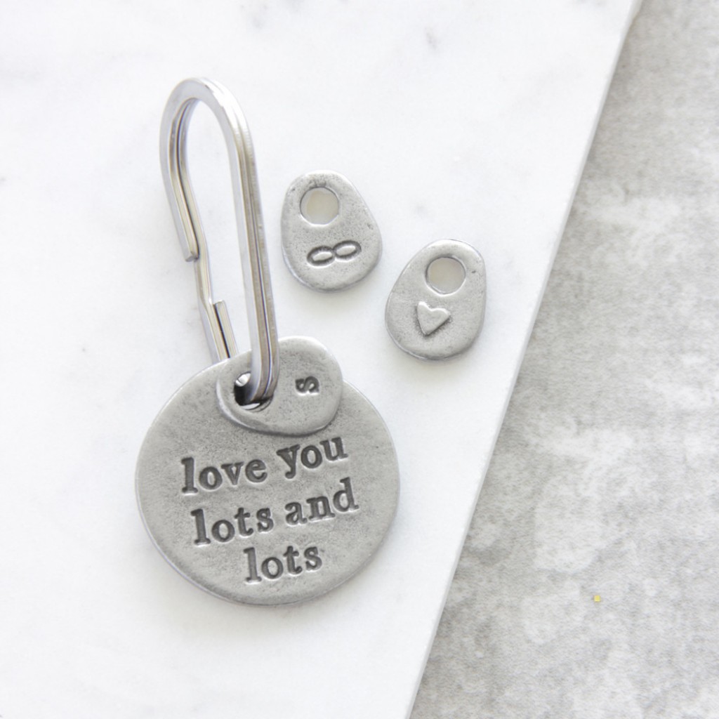 This keepsake keyring is imprinted with the sweet phrase "love you lots and lots" and attached to a ring to hold all your keys.