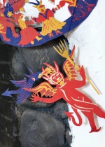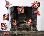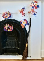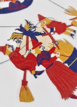 Hand printed three metre long paper garland, featuring ten screen printed paper medieval witches. The garland is printed on both sides on thick, hand made cotton paper. The shapes are sewn in a random order along strong cotton thread, with hanging loops either end, meaning the garland can be hung straight away!