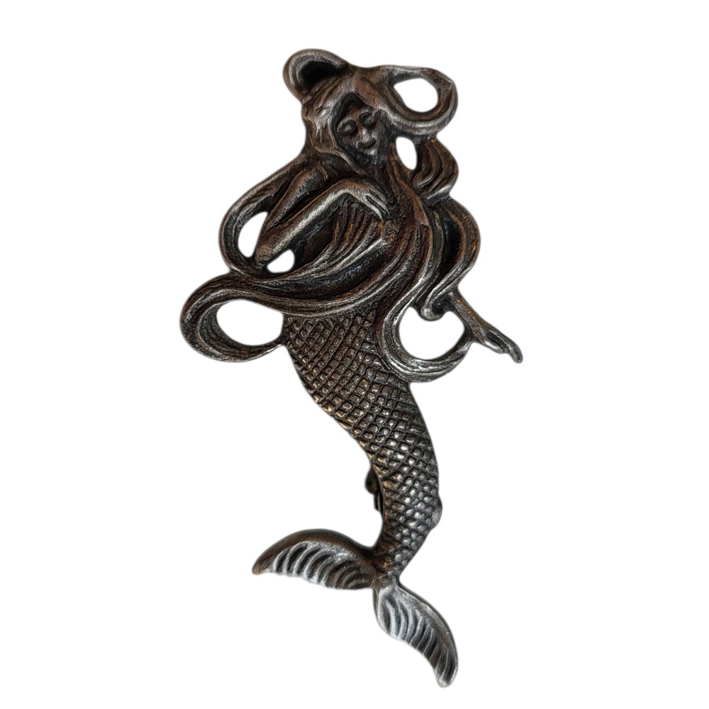 A glamorous Mermaid brooch in cast lead free pewter,makes a fun addition to any outfit or hat. Hand finished.