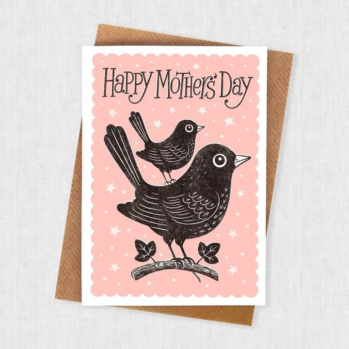 A hand drawn blackbird Mother's Day card, this eye catching design will really stand out on her shelf and remind her how much she's appreciated. The decoration continues on the reverse of the card with a matching nude pink pattern. Blank inside for a personal message.