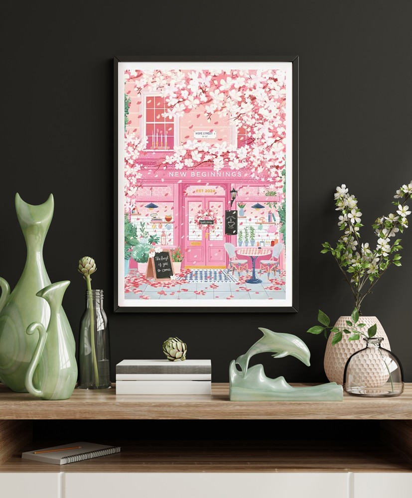 Add a touch of positivity to your walls with the 'New Beginnings Cafe'. This beautiful wall art, awash in delicate shades of pink, showcases cherry blossoms gently cascading down the cafe, creating a captivating scene that will infuse your space with warmth and renewal.