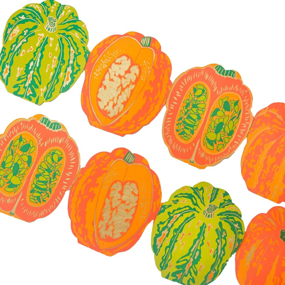 A concertina folded paper garland featuring squashes, gourds and pumpkins, perfect for Autumn time!