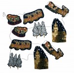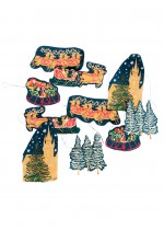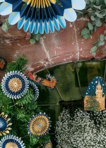 The Skyline Garland is a three metre long paper garland, featuring ten hand screen printed paper vintage scenes.The garland is printed on both sides on thick, hand made cotton paper. The shapes are sewn in a random order along strong cotton thread, with hanging loops either end, meaning the garland can be hung straight away.