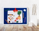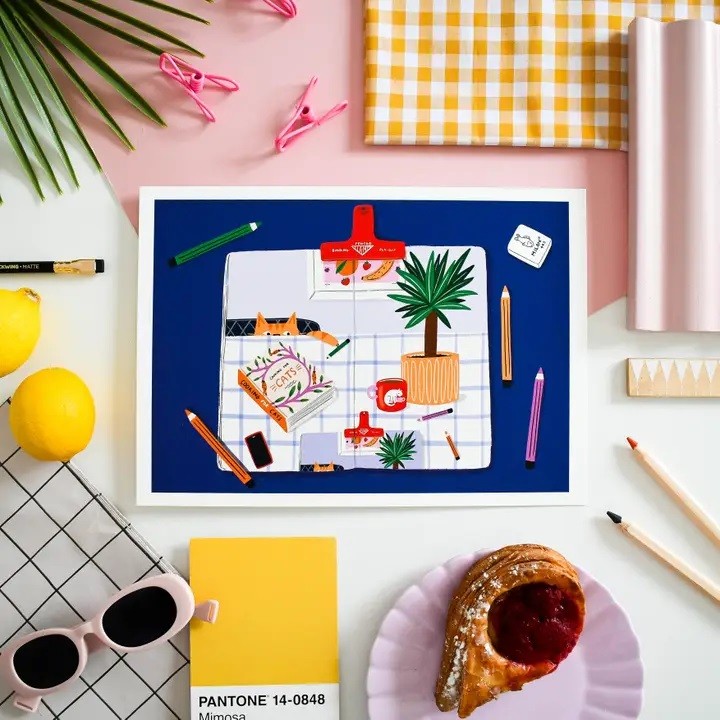 Colourful and contemporary still life with a mischievous cat. The perfect print for cat lovers.