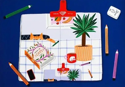 Colourful and contemporary still life with a mischievous cat. The perfect print for cat lovers.