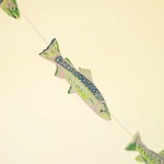 Hand printed three metre long paper garland, featuring an assortment of screen printed paper anchovies. The garland is printed on both sides on thick, hand made cotton paper. The shapes are sewn in a random order along strong cotton thread, with hanging loops either end, meaning the garland can be hung straight away!