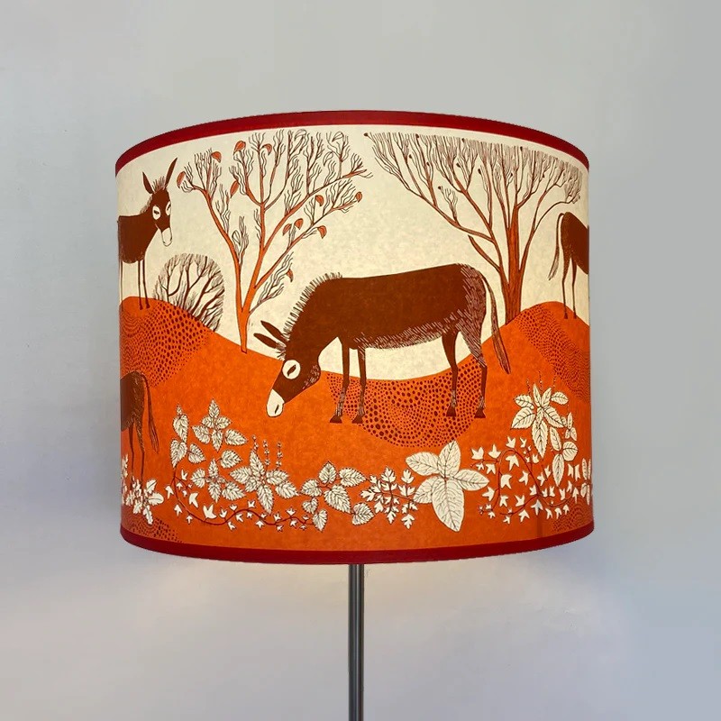 A delightful lampshade featuring darling donkeys in a pretty landscape with native wild flowers. Inspired by the retired donkeys that once gave rides to children on Blackheath and now enjoy retirement in Eltham in South East London.