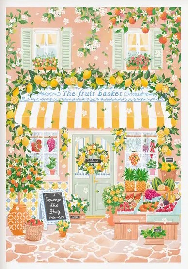 This joyful art print captures the magic of slow summer mornings and the charm of a local village fruit stall, overflowing with colour and life. From lemon garlands and terracotta pots to striped awnings and crates of fresh produce, every detail invites you to pause, smile, and savour the simple pleasures of the season.