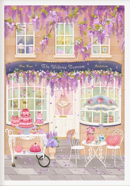 Bring soft spring charm into your home with this romantic wisteria café illustration. Illustrated pastel tearoom storefront to capture cascading lilac blooms, delicate pink cakes and a cosy vintage bistro setting.
