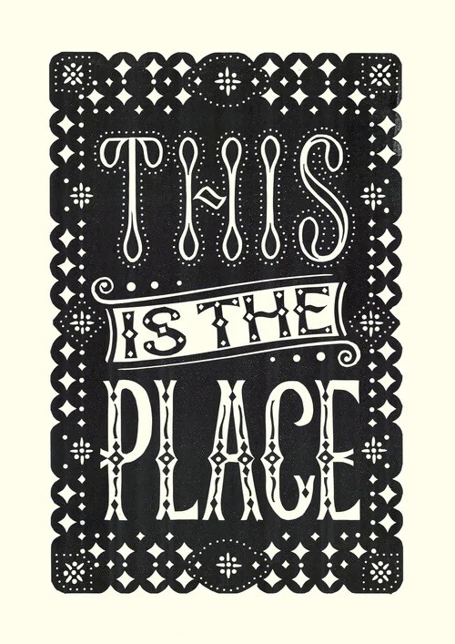 "This Is The Place" – A3 Linocut Print (Black or Fluorescent Red). Mark your space with presence, pride, and personality with this linocut print – a typographic tribute to belonging and the power of place.