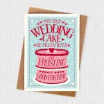 A hand lettered wedding card featuring a pink cake and a fun, good luck message for the happy couple. Printed in contrasting colours of deep pink, red and aqua blue.