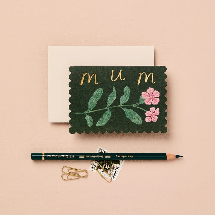 A mini card perfect for Mother's Day. This card has a deep green background, a gouache watercolour illustration, and scalloped edges.