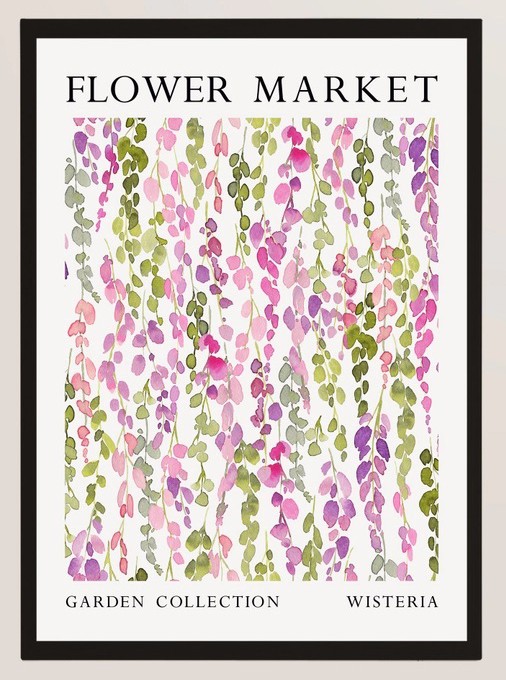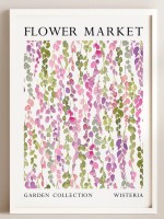 A botanical art print featuring a colourful hand drawn wisteria pattern in an exhibition poster style layout.