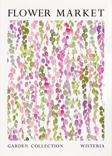 A botanical art print featuring a colourful hand drawn wisteria pattern in an exhibition poster style layout.